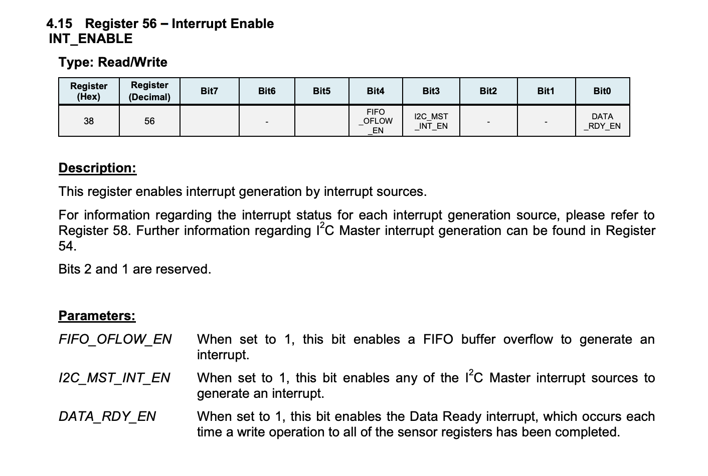 | MPU_Write_Byte(MPU_INTBP_CFG_REG, 0xA0); MPU_Write_Byte(MPU_MDETECT_CTRL_REG, 0x1F); MPU_Write_Byte(MPU_MOTION_DET_REG, 0x01); MPU_Write_Byte(MPU_INT_EN_REG, 0x40);